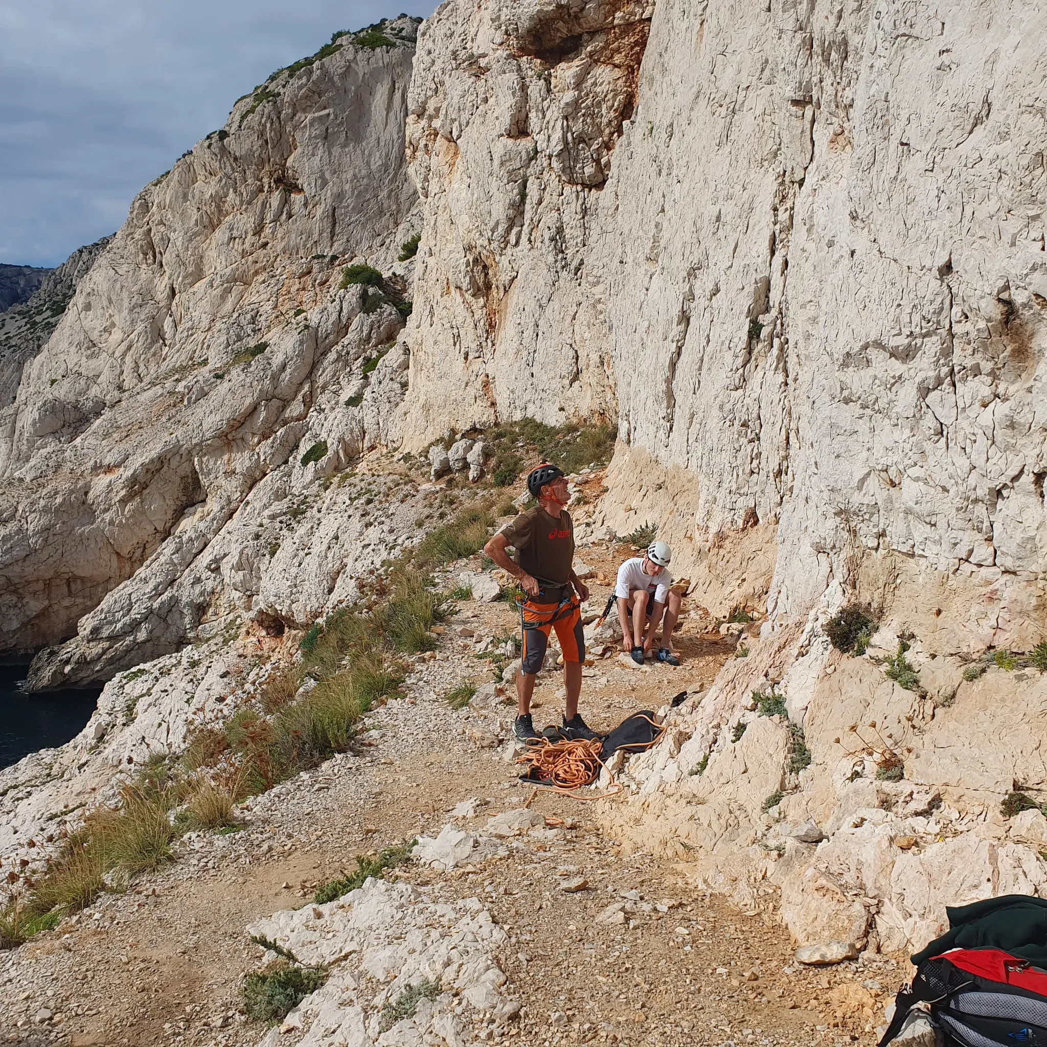 Nous trouvons au 2/3 de la voie une vire qui nous permet de faire une petite pause avec vue sur la Calanque d’En-vau. Le sommet n’étant que deux ou trois longueurs au-dessus nous en profitons pour casser la croûte.