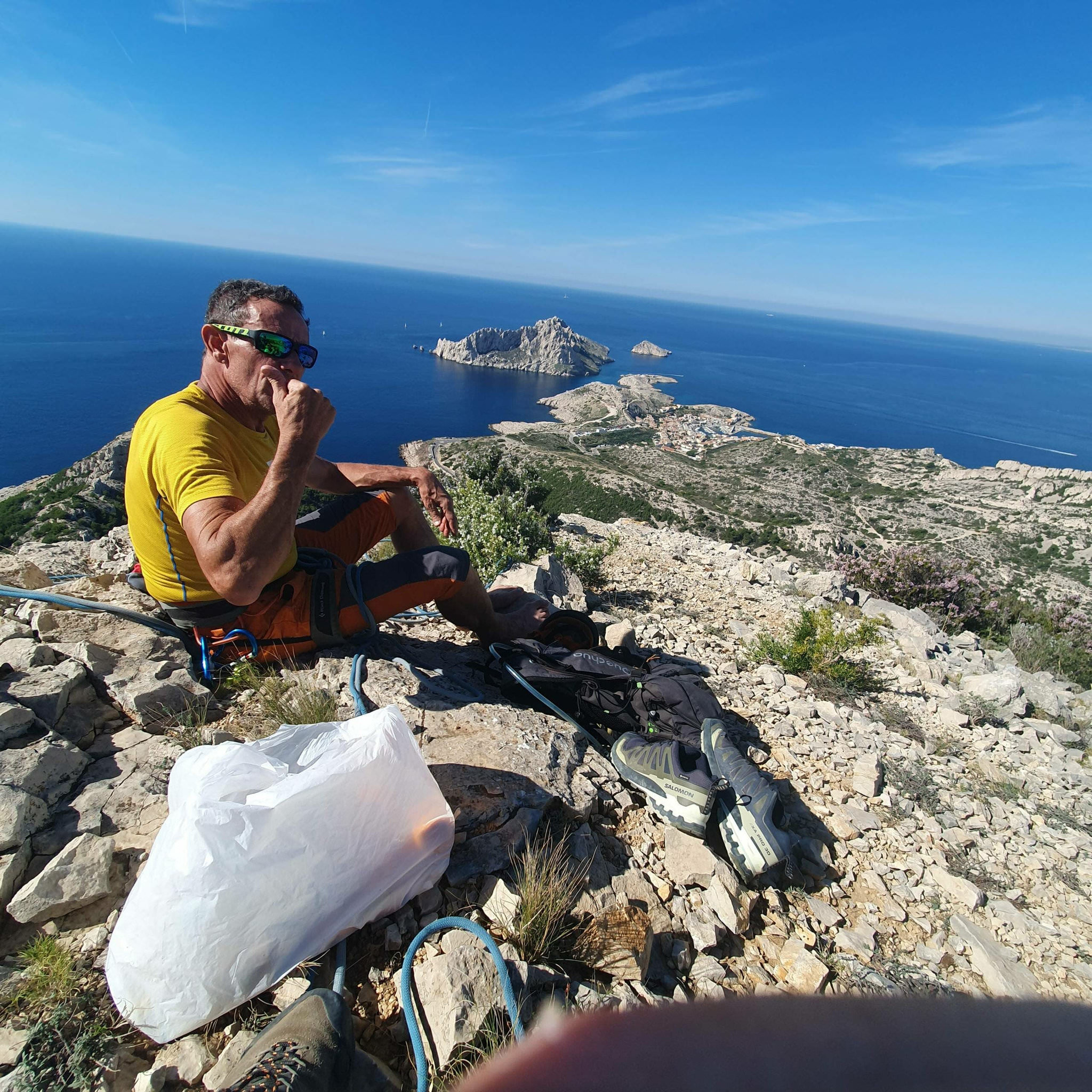 Arrivée au sommet on se décale un petit peu pour casser la croûte avec vue sur la Calanque de Morgiou et également sur la crête de Marseille que j’avais en tête pour l’après-midi.